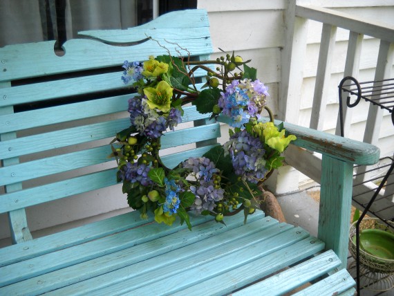 I currently have a Hydrangea blooming in my yard, so I thought it would be nice to show the silk Hydrangea and the natural Hydrangea together for comparison. The blooms on the wreath are a little smaller than the blooms on the plant, but I really like the wild, natural look of the wreath.