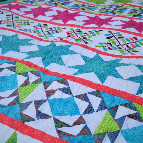 Stars and Stripes is backed with Island Batik's Mardigras fabric.  I used the same dotty blue fabric for the binding as I used on the outer border.  I like to match my binding and border fabric.