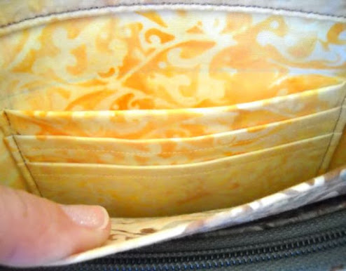 Inside pocket for carrying credit cards, driver's license, etc. The larger size bag has a double wide pocket like this.